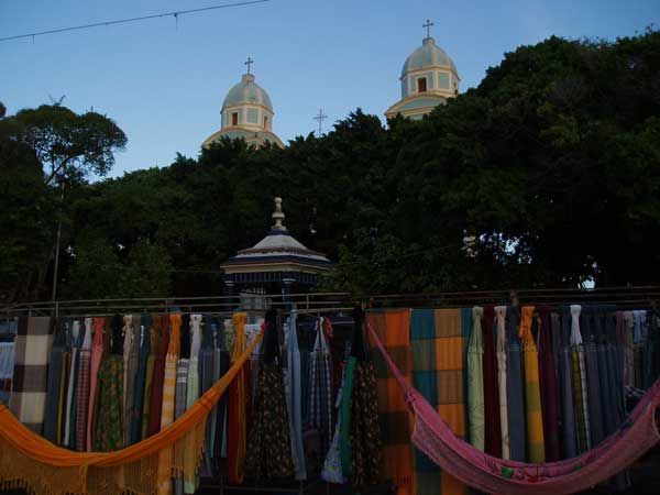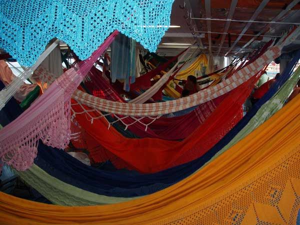 besteckten Stände. In allen Regenbogenfarben, mit oder ohne Muster, „casal“ oder „soltero“ (Paar oder Alleinschläfer), mit oder ohne Troddeln u.s.w. - ich bekam sie von einer gemütlichen Dicken alle gezeigt und ihre jeweiligen Vorzüge beschrieben. Doch ich brauchte ja nur eine Matte für ein paar Nächte, die ich dann, auf leichtes Gepäck bedacht, verschenken würde.