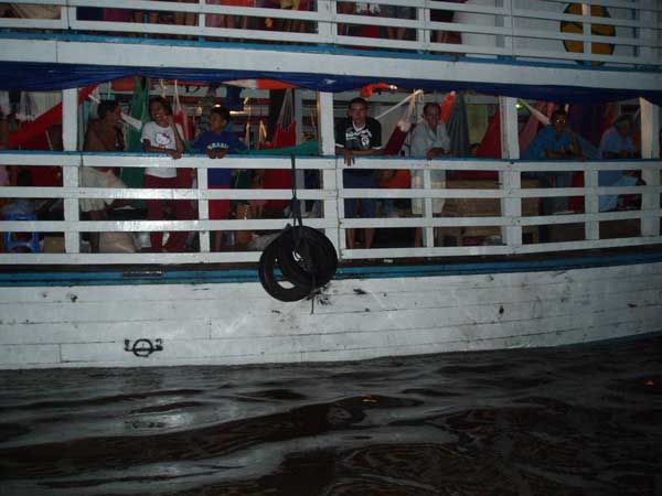 Das einzig wirklich Saubere auf dem Schiff war die Uniform des Kapitäns (den angeblich mitreisenden Jesus bekam ich nicht zu Gesicht, wahrscheinlich wieder so ein blinder Passagier), davon konnte ich mich kurz vor Òbidos im Schein der - wie ich noch glaubte zwecks Anlegen - eingeschalteten Lampen erneut überzeugen, als er an meine Hängematte trat und sagte:“ Wir legen nicht im Hafen von Òbidos an ...“ - der Schreck durchfuhr mich, Òbidos stand doch auf meinem Fahrschein! - „ ... Sie sind der einzige Passagier, der nach Òbidos will ...“ - Na und!? Muss ich deswegen zur Strafe nach Manaus zurück?! - „ ....deswegen holt Sie ein Boot in der Mitte des Flusses ab. In einer Stunde sind wir da.“