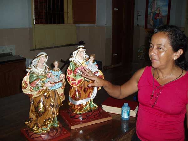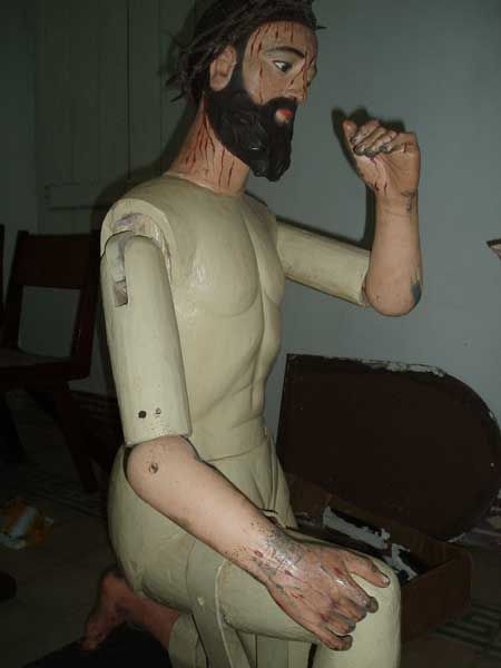 Die wird gerade, in einem hinteren Raum der Kirche, mitsamt ihrem Jesusknaben auf dem Arm, einer gründlichen Reinigung mit anschliessendem Neuanstrich unterzogen. Das macht ein schwarzer junger Mann mit ganzer Hingabe. Er erläutert mir seine Technik der Bemalung mit einer Art Plakafarbe, die so ziemlich genau ein Jahr hält - durchaus so vorgesehen, da er diese Zeremonie jeweils wiederholen und damit sein Können immer wieder unter Beweis stellen kann.