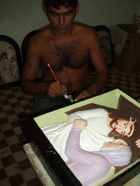 Auf dem Boden liegen zum Trocknen ausgebreitet die Bilder der Kreuzwegstationen, grandios bunt und - kitschig will ich schon schreiben, aber was soll die Einordnung in unseren Kunstverstand bei einer derart schlichten Volksfrömmigkeit, wie sie hier allenthalben vorherrscht. (Ich habe ein Dutzend Sekten gezählt, und das sind längst nicht alle, die der katholischen Kirche den Rang ablaufen und die Schlichtheit des Angebots der Einzig Wahren Kirche (EWK) noch glatt unterbieten - allerdings beuten sie die Menschen noch zusätzlich finanziell aus).