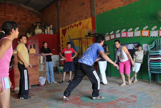 Um 10 kommen die zwei freiwilligen, aber professionellen „Capoeira“ – Trainer, die einmal pro Woche eine Gruppe vormittags und eine andere nachmittags trainieren. „Trainieren“ ist es wirklich, wenn man die (älteren) Kinder schwitzen und ihre Vorübungen machen sieht. Und dann wirkliches Capoeira, nicht wie in Brasilien, aber sehenswert! Angedeutete Selbstverteidigung, fast tänzerisch.
