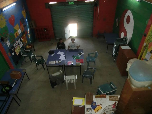 Ohne Kinderlärm, denn heute ist Konferenztag im Hort. Ich bin von der Autofahrt so steif in den Gliedern, dass ich kaum durch das kleine im Rollgitter eingelassene Törchen nach innen gelange, der Erzieher Gustavo will mir schon zu Hilfe eilen.....