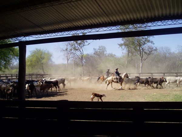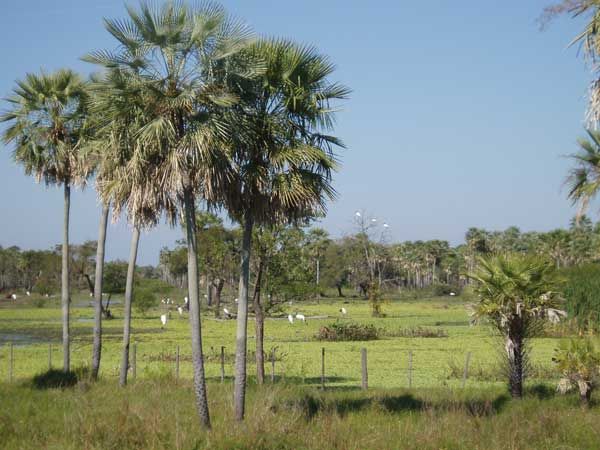 Kaum auf der anderen Seite des Flusses angekommen, ändert sich das Landschaftsbild - ja, ein ganz neues Panorama tut sich auf: Grasflächen dehnen sich in endlose Weiten, gepunktet von den weiß-grauen Rücken grasender Rinder. Aber das Charakteristische sind die Galerien von Carandaí–Palmen mit ihren schlanken Stämmen und den im Wind flirrenden Fächern - von diesen Vielzweckbäumen muss es in Paraguay die hundert - und tausendfache Menge der Einwohnerzahl geben! Man findet ihre Stämme allenthalben wieder - verwandelt in Gatter, Zäune, Verladerampen und Eingangsportale der vielen Estancias, die die Strauße säumen, und lässt man den Blick im Inneren des Busses schweifen, sieht man ihre Blätter, verarbeitet zu sombreros, auf jedem zweiten Männerkopf.