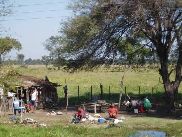 Wie es vielen indianischen Brüdern der Ayoreo geht, erleben wir auf der Rückfahrt aus dem Chaco. Immer wieder tauchen neben der Ruta Transchaco Behausungen indianischer Familien auf, grob zusammen gezimmerte Hütten aus Carandaí- Stämmen, manchmal auch nur elende Notunterkünfte aus schwarzer Zeltplane. Hier sind die einstigen Bewohner des Chaco zu einem wahren Hungerdasein verurteilt, Bettler am Rand der großen Straße, ohne eigenes Land, ohne ausreichende Nahrung, ohne gesundheitliche Versorgung, von Schulbildung für ihre Kinder ganz zu schweigen.
