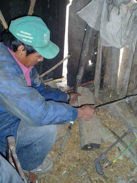 Für uns eine gute Gelegenheit, uns selbst ein Bild davon zu machen, wie in Handarbeit mit einfachsten Werkzeugen die in Deutschland geschätzten Tierfiguren aus Palo Santo-Holz geschnitzt werden. Kaum hat Hermann den Wunsch geäußert, bei der Herstellung zuzusehen, wird er umringt von lebhaften Jugendlichen, die ihn alle mit in die eigene Hütte ziehen wollen.