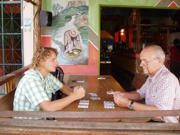 Viel Zeit zu erzählen bleibt allerdings nicht, gleich nach meiner Ankunft hatte er mich gefragt, ob ich Skat spiele. Mein Ja euphorisierte ihn geradezu und führte zu einem ausgedehnten Skatabend auf der windigen Terrasse. Dritter im Bunde war Kai, ein in Venezuela gestrandeter langmähniger Freak, der hier beim alten Lobo so wirkte, als sei er „auf Besserung“, und dessen Tätowierungen mit original indianischen Häuptlingsköpfen und weisen Sprüchen ich beim Reizen Gelegenheit hatte zu studieren. War ich soeben am Orinoco noch Zeuge indianischen Elends, so bot mir hier Kai die romantisierende Variante des von Hause aus weisen Indianers dar.