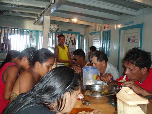 Die „11. Mai“ legt am 10. Juli in Óbidos ab und soll zweieinhalb Tage und zwei Nächte später in Belèm ankommen. Es ist Tag und ich kann mir in Ruhe alles genau ansehen, am Interessantesten sind wie immer die Passagiere, unter ihnen diesmal auch einige wenige aus Europa, drei Norweger und zwei Norwegerinnen, die ersten Vertreter dieser Nation, die hier in diesen Breitengraden kennen zu lernen ich das nicht ganz gelungene Vergnügen habe. Sie sind seit Manaus an Bord und wirken dementsprechend abgeklärt, wir reden in drei Sprachen, allein es hätten auch fünf oder sechs sein können, ein Dialog kam nicht zustande. Mein unabweisbares Gefühl war, sie hätten den Amazonas gern für sich allein gehabt. Ich muss irgendwann weitere Norweger kennen lernen, um mein Bild über die nördlichen Nachbarn zu erweitern.