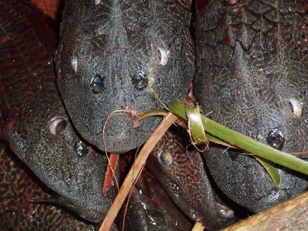 Açaí: Darüber hatte ich schon geschrieben, hier in Belèm im Ver-o-Peso-Markt ist ein ganzer Abschnitt der Kaianlagen für die Anlandung dieser so beliebten Frucht reserviert. Man läuft wohl hundert Meter über Kopfsteinpflaster, dessen Rillen mit den kleinen dunkelblauen bis schwarzen Früchten angefüllt sind, die beim Transport in den eigens dafür angefertigten Flechtkörben verloren gingen. Kein Wunder, werden die offenen, randvoll mit Açaí gefüllten Körbe doch von Mann zu Mann geworfen und dann in Karren gestapelt, der geringe Schwund wird einkalkuliert. Ich hatte das Gefühl, eine Zirkusnummer zu erleben und schaute so lange in praller Sonne zu, bis ich fast einen Sonnenstich bekam.