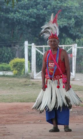 Die macá lebten ursprünglich im Chaco, noch bis zum Chacokrieg 1930 – 35 zwischen Paraguay und Bolivien verteidigten sie ihren Lebensraum und ihre Identität. Nach dem Krieg wurden sie nach Asunción „verbracht“, wo sie immer noch wie in einem Reservat leben, andererseits aber auch ein ziemlich selbstverständlicher Teil der Gesellschaft sind. Zumal man sie überall, bis ins Stadtzentrum, sieht, sogar am Abend wie auf dem Foto.