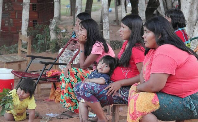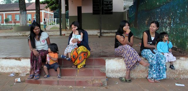 Man muss zweimal hinschauen: Kein Müttertreff in einem bürgerlichen Viertel Asuncions, sondern indigene Frauen der maká, die in ihrem barrio, einem entlegenen Viertel der Hauptstadt, mit ihren Kindern auf den Stufen ihrer eigenen Schule sitzen.