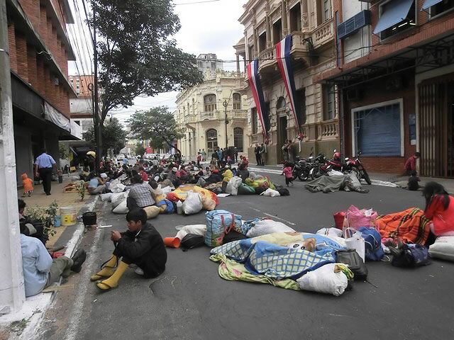 In ihren langen Röcken spielen sie ausdauernd - nicht gerade nach unseren Regeln, aber sehr geschickt und engagiert - und es klatscht auch viel lauter. Das Zuschauen macht richtig Spaß, nicht nur mir. Zwei Tage später im Zentrum von Asunción: Schluss mit Folklore, da besetzt bzw. „belegt“ eine Indigenen- gruppe aus der Nähe von Concepción für viele Stunden eine wichtige Straße.Die Polizei hält sich zurück.