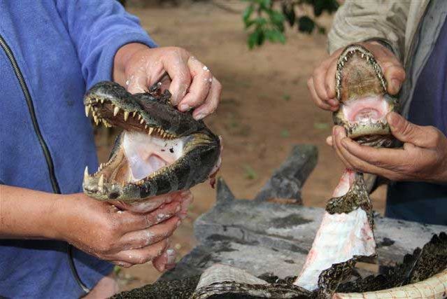 Tags zuvor hatten wir Haus und finca des Isabelino Garcete, Vater unseres Stipendiaten Adolfo, besucht. Am Anfang stand ein doppeltes Gruseln: Frau Garcete nahm gerade ein jacaré (Kaiman) aus, holte das Fleisch aus den beiden Köpfen, als seien es keine Echsen, sondern Hühnchen. Zum Trocknen wurden Kopf und Panzer auf die Leine gehängt.