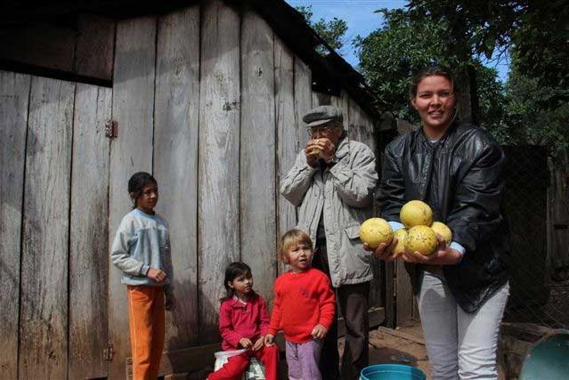 Fast hätte ich es vergessen: Niemals verlässt man in Paraguay auf dem Land eine Familie, ohne irgendetwas mit auf den Weg zu bekommen - das ist ganz undenkbar. Heute sind es dicke, erstaunlich süße pomelos, Pampelmusen, die Raquel uns noch fix vom Baum geschüttelt hat. Oscar lutscht schon eine aus, so wie man es in Paraguay macht: Schälen (aber nur die äußere gelbe Schale), oben ein Loch hinein schneiden, dann die Frucht, die jetzt an ein geschorenes Schaf erinnert, kräftig kneten und - Mund am Loch - aussaugen. Herrlich!