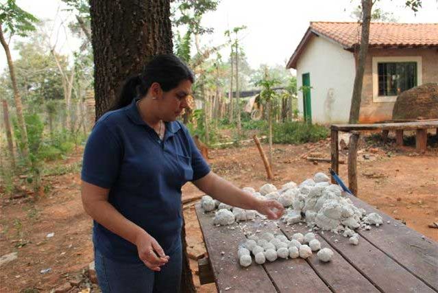 Der Nachbar schmiert gerade Löcher zu. Ein Sack Kohle bringt ca. 30 Cent, da muss schon ein Lastwagen voll beladen werden, damit sich die Knochenarbeit - vom Abholzen über das Zerteilen bis zum Meilerbau, Einsetzen, Ausräumen und Verladen - auch nur einigermaßen lohnt (ca. 50 Euro).Jetzt aber auf den Acker! Die achtköpfige Familie teilt sich die Arbeit und den Ertrag aus einem Anbau, den zu lernen Señor Garcete nicht leicht fiel, wie er betont: Vier verschiedene Nutzpflanzen auf demselben Feld - das gab es doch früher nie! Jetzt aber wachsen Manniok, Mais, Bohnen und Erbsen nicht nur einträchtig nebeneinander, sondern begünstigen sich auch gegenseitig in ihrem Wachstum. Für den Verkauf und die Erzielung von Bargeld baut Garcete Bataten an, wunderbar rote leuchtende Knollen, die er putzt, wie um ihre Schönheit zur Geltung zu bringen. Zwischen 1000 und 1500 Guaraníes (25 Eurocent) erzielt er für das Kilogramm, da kommt einiges zusammen. Seine sieben ha hat er zu 80% bepflanzt, 20% bleiben als ökologische Reserve.